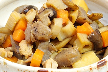 それぞれ名前の中に「ん」がつく食材が使用されており、「運」がつく縁起の良いものと考えられています。家庭によって使用する食材が異なりますが、「だいこん」「れんこん」「こんにゃく」「にんじん」といったように「ん」がつく食材が多く使われています。「ん」はつきませんが、鶏肉が必ず入るのも筑前煮の特徴です。