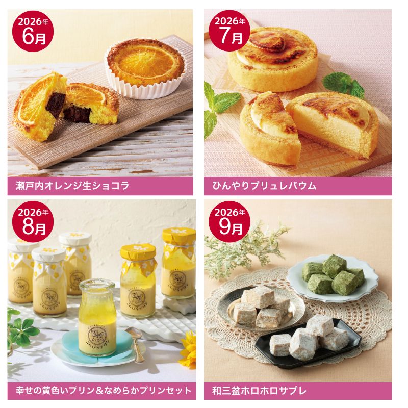 | 2026年 6月 | 瀬戸内オレンジ生ショコラ | ●商品内容/10個 ●原料原産地/オレンジ=国産 ●賞味期間/常温で30日 ●アレルギー/「小麦」「卵」「乳」 伊予柑ピールを入れてしっとり焼き上げたマドレーヌに、芳醇な瀬戸内産オレンジのスライスをのせた瀬戸の焼菓子。オレンジに相性のよいチョコレートをセンターにしのばせました。 | 2026年6月23日 |