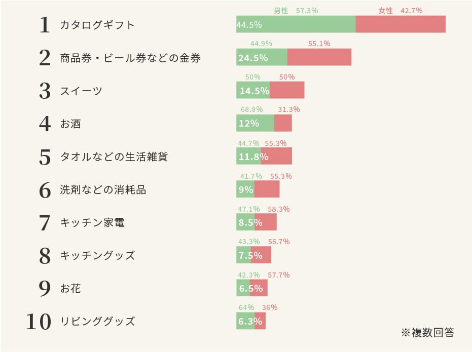 2位の「おいしいもの」、3位「欲しかったもの・不足しているもの」などは、お相手の好みや価値観、ライフスタイルによって求める品はさまざま。「もらってうれしいランキング」で1位と2位になった、お相手が好きなものを選べる「カタログギフト」や「商品券・ビール券などの金券」と一致している結果といえそうです。