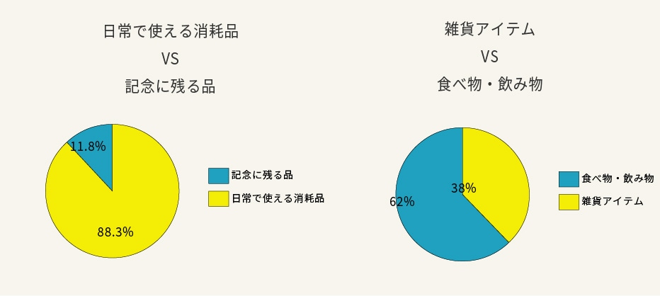 また、4位の「お酒」の男女比を見ると、男性により多く支持されている傾向が見て取れます。男女の好みの差も参考にしてみてください。