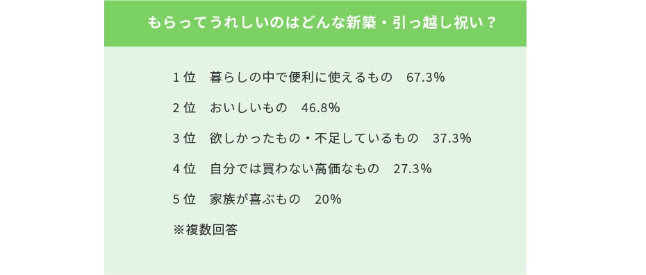 どのような新築・引っ越し祝いがうれしいかのアンケートでは、1位は「暮らしの中で便利に使えるもの」。前項でもキーワードになった“実用性のあるもの”は、やはり大きなポイントになりそうです。