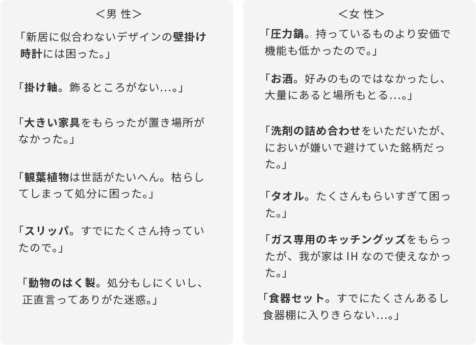 その他のエピソードでは、壁掛け時計や掛け軸などインテリア用品が目立つ結果に。デザインや色合いなど好みは人それぞれなので、家に飾るものは自分で選びたいという人が多いようです。意外なのは、タオルや食器セットなどの実用品。たくさんもらった、またはすでにたくさん持っていたなどの理由で困ってしまうことがあるようです。
