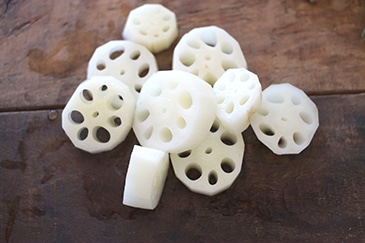 れんこんは筑前煮や煮しめに使われたり、主役として酢れんこんにしたりとさまざまな料理でおいしくいただけます。穴の形に沿うように数ミリの厚さを残して飾り切りすると、蓮の花のような美しい花れんこんとなり重箱の中を華やかにしてくれます。
