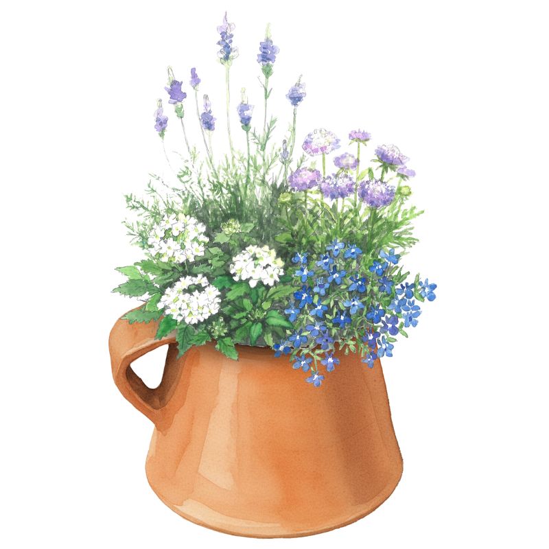 ●商品内容/サイズ(約)=高さ30cm 鉢/直径22cm 花材=レースラベンダー、スカビオサ、バーベナ、ロベリア