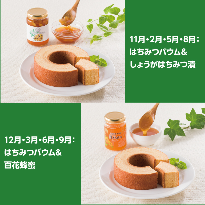 山田養蜂場が厳選したはちみつと、はちみつを生地に練り込んだ、しっとりとした食感と美しい焼き色が特長のバウムクーヘンをセットでお届けするコースです。