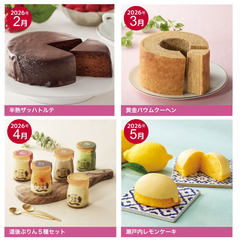 | 2026年 5月 | 瀬戸内レモンケーキ | ●商品内容/10個 ●原料原産地/レモン=国産 ●賞味期間/常温で30日 ●アレルギー/「小麦」「卵」「乳」 瀬戸内レモンを使用しさわやかな風味豊かに焼き上げました。しっとりとした食感に仕上げています。 | 2026年5月24日 |