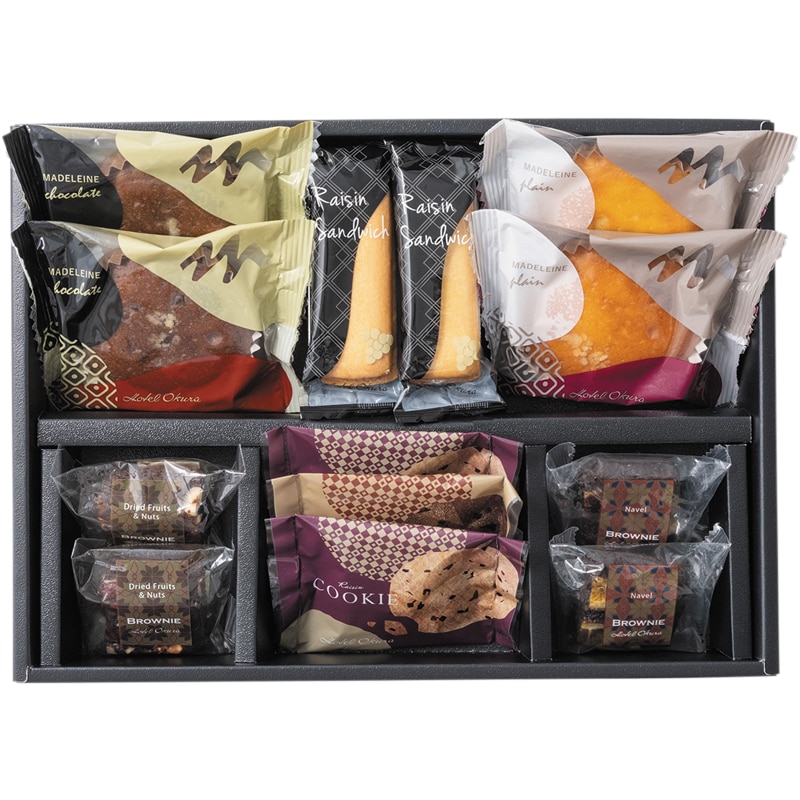 ●商品内容/クッキー(レーズン・チョコチップ 各3)、ブラウニー(ネーブル・ドライフルーツ&ナッツ 各2)、マドレーヌ(プレーン・チョコ 各2)、レーズンサンド×2 ※本品はアルコールを含んでいます。お子様やアルコールに弱い方、乗り物を運転する方、妊娠・授乳期の方はご遠慮ください。 ※はちみつ入りなので1歳未満の乳児には与えないでください。