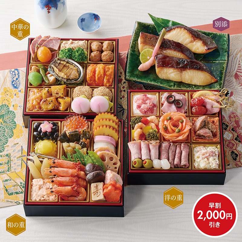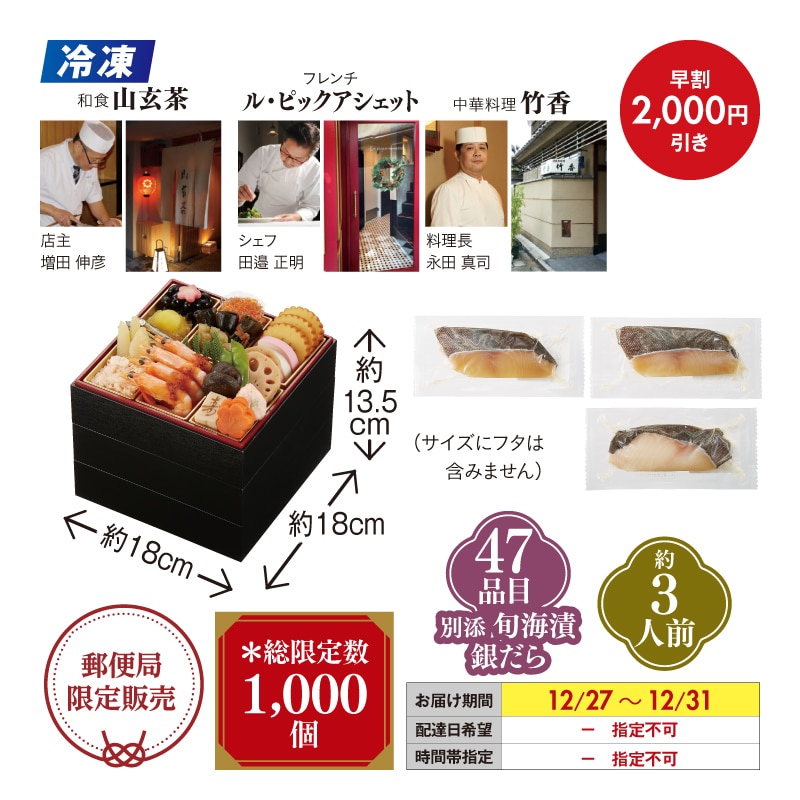 <おせち>【早割】【冷凍】京都三銘店監修 和洋中三段重と旬海漬銀だら3切付き