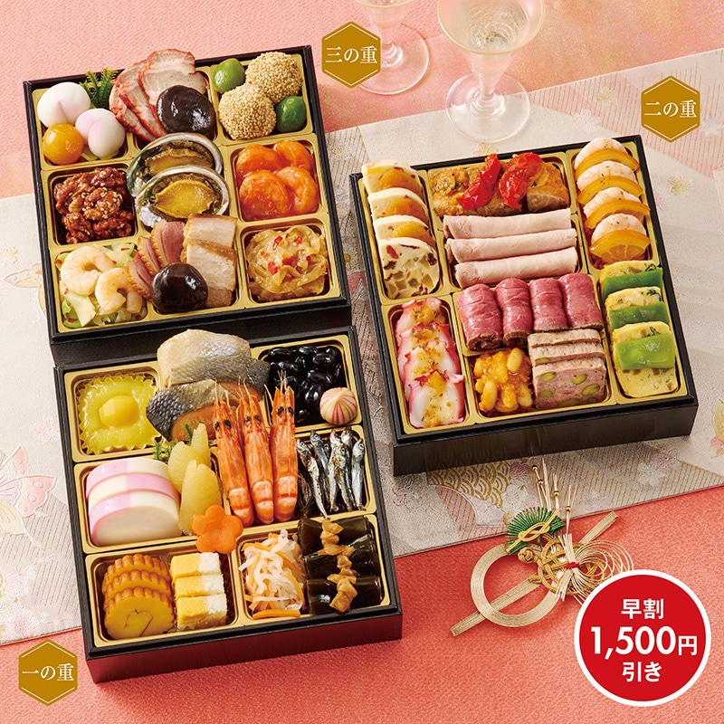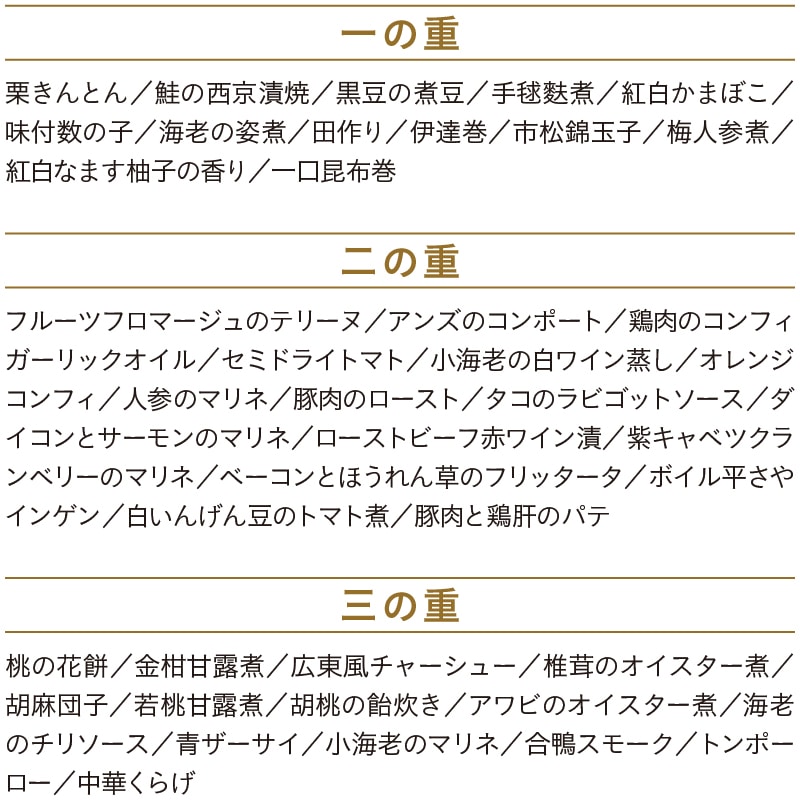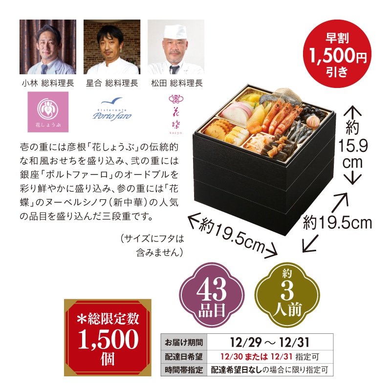 <おせち>【早割】彦根「花しょうぶ」・銀座「ポルトファーロ」・銀座「花蝶」 コラボおせち 和洋中「饗宴」三段重