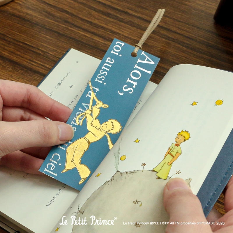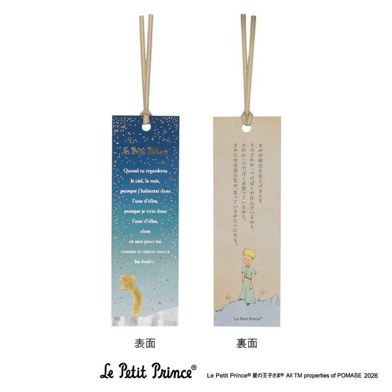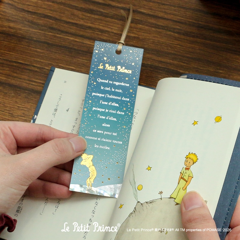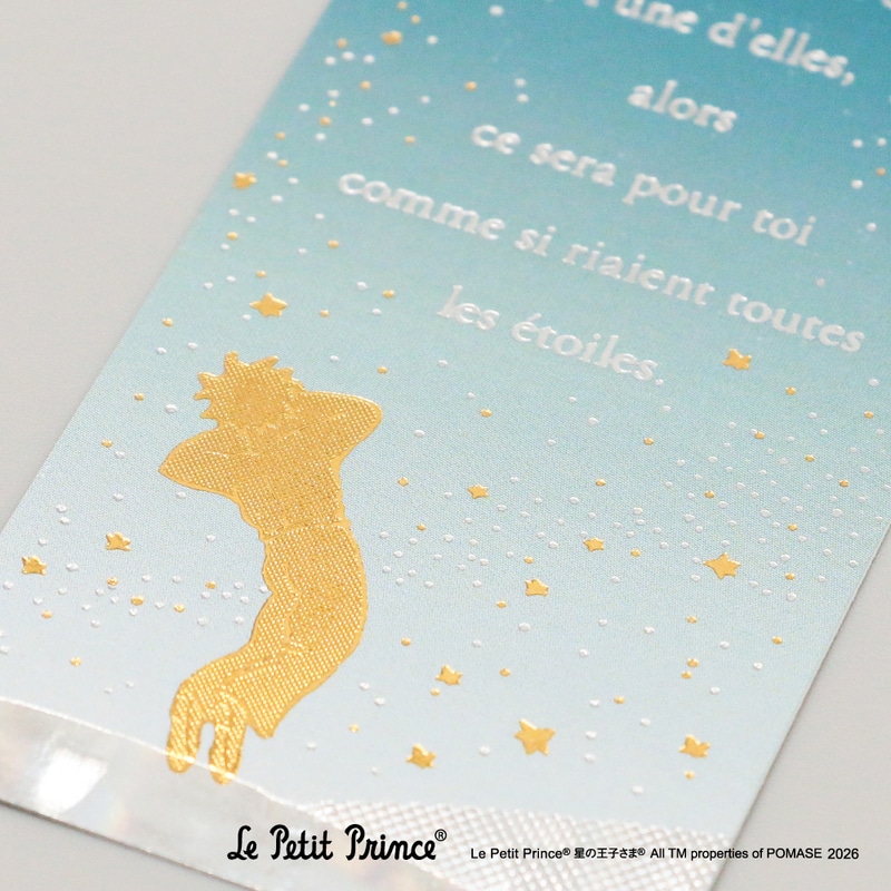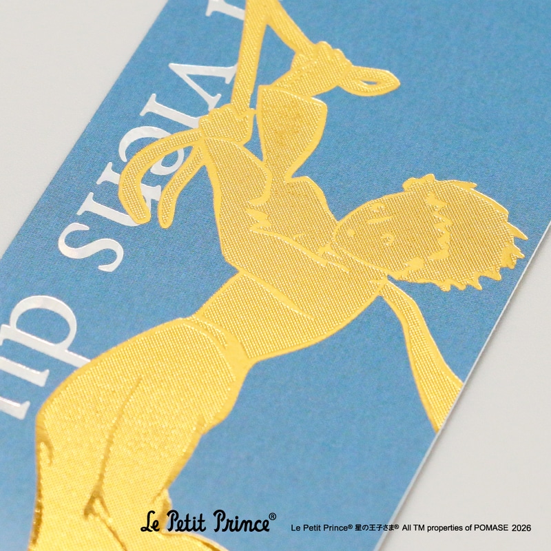 名作「星の王子さま」と箔押しブランド「ROKKAKU」がコラボレーション。星の王子さまの物語を楽しめる、言葉入りのしおりです。表面にはフランス語の原文を、裏面には日本語訳を記載し、物語の魅力を両面から感じていただけるよう工夫しました。さらに、表面には2色の箔を施し、アンティーク調の金色の紐で仕上げることで、上品さと高級感を演出しています。モチーフは星空とバラで、1枚目は特に有名な名言を掲載し、裏面を挿絵風にしています。2枚目は王子さまとバラを大胆に配置することで、よりデザイン性の高い仕上がりにしました。これら2枚のセットになっています。