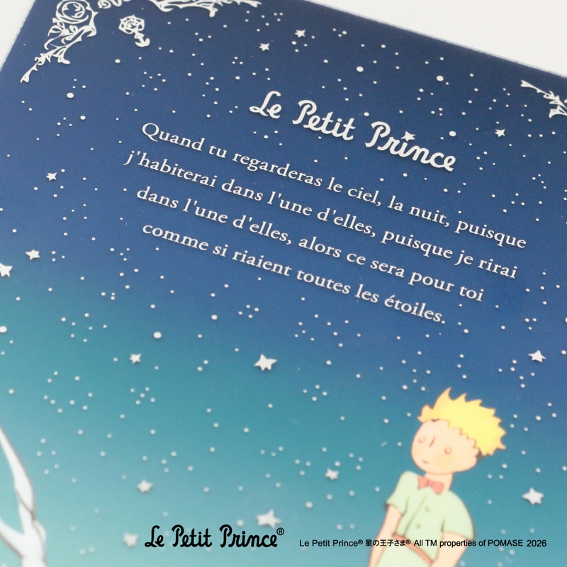 王子様が夜空や夕日を眺める幻想的なデザインのクリアカードです。箔押しされた星やフレームがきらきら輝きます。フレームには作品で象徴的な存在であるバラをあしらい、作品のテーマ性を大切に表現しています。