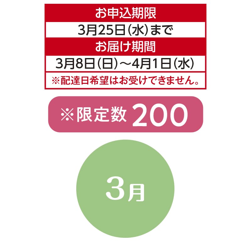 ※天候や生育状況等により予定の時期よりもお届けが前後することがございます。その際は、早着・ 遅延のご案内、代替商品又は解約等のご案内をさせていただく場合がございます。