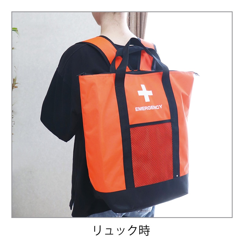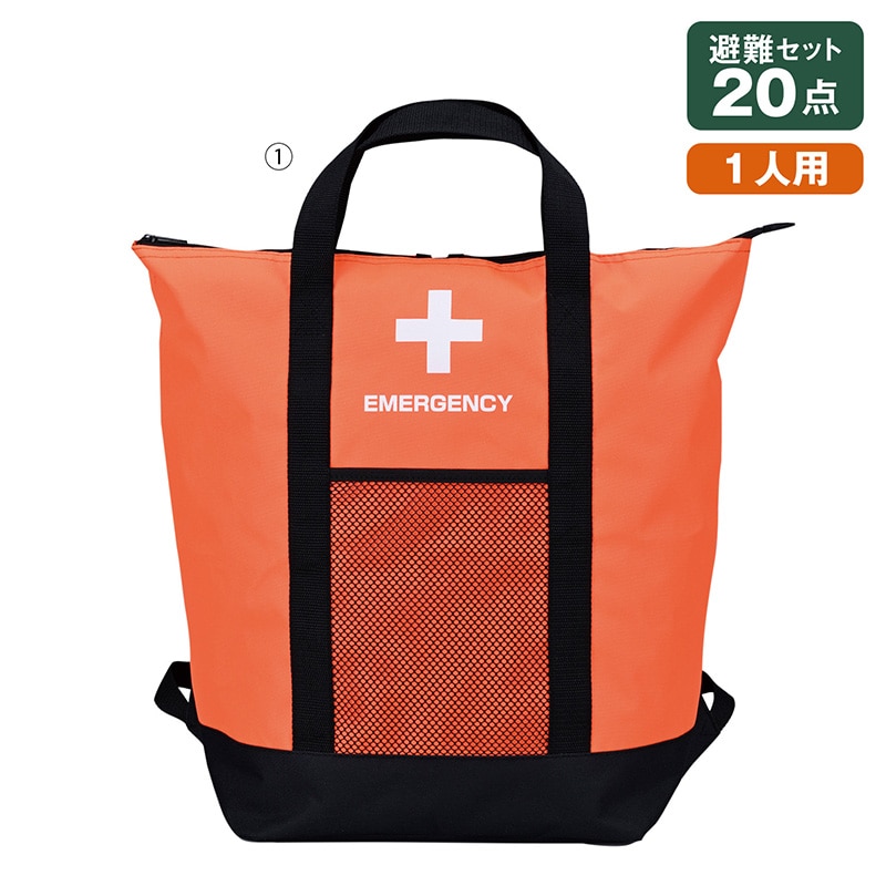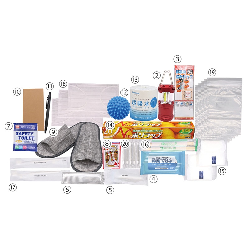 ※大小兼用(8)トランプ(9)スリッパ(10)メモ帳(11)ボールペン(12)心のケアボール(13)トイレットペーパー(27.5m、2枚重ね)(14)ポリラップ(20m)(15)生理用品×2(16)割り箸×2(17)歯ブラシ×2(18)マスク×3(19)チャック袋×5(20)綿棒×5 サイズ(約)=リュック/タテ43×ヨコ30(最大ヨコ45.5)×マチ16cm 持ち手立ち上り12cm リュックベルト長さ44〜47cm 重さ(約)=890g(リュックのみ240g) 素材=リュック/ポリエステル(裏地アルミ蒸着フィルム加工) 中国製((4)、(7)、(13)〜(15)は日本製、(5)、(16)はベトナム製)