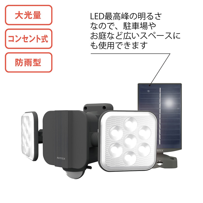 ●付属品/ネジ・プラスチックアンカー 各4個、クランプ台・蝶ナット・L型ボルト・ネジキャップ 各2個 明るさ最大1200lm 探知範囲(約)/180° 距離(約)/8m ライト点灯切替3段階(昼・夜・OFF) 1年間保証書付。