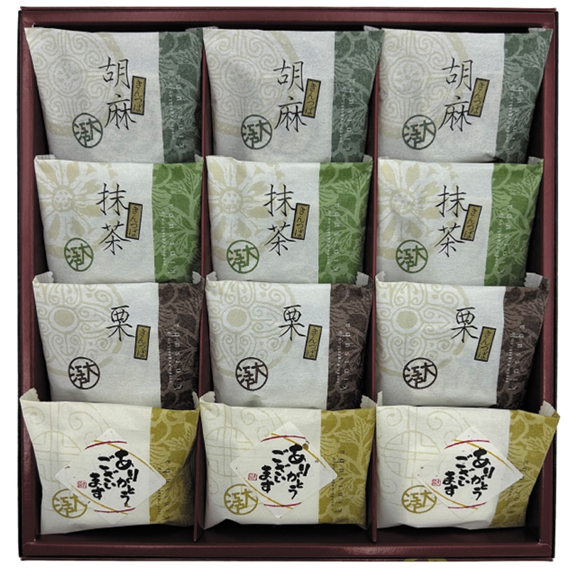 ●商品内容/小豆(ありがとう!焼印)・栗・抹茶・胡麻 各3