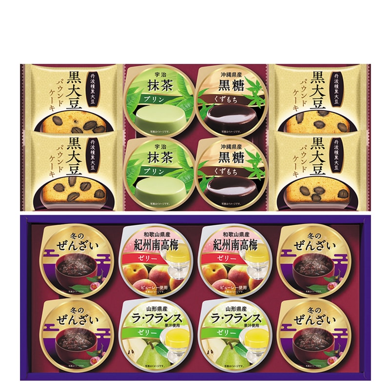 ●商品内容/冬のぜんざい50g×4、宇治抹茶プリン・沖縄県産黒糖くずもち 各57g×2、山形県産ラ フランス果汁使用ゼリー・和歌山県産紀州南高梅ゼリー 各62g×2、黒大豆パウンドケーキ×4