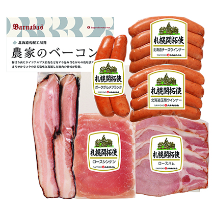 ●商品内容/農家のベーコンステーキカット126g、北海道玉葱ウインナー・北海道チーズウインナー 各100g、北海道ポークグルメフランク120g、ロースハム65g、ロースシンケン(生ハム)40g