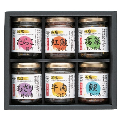 ●商品内容/減塩牛肉ごぼう60g、減塩紅鮭ほぐし・減塩高菜ちりめん 各80g、減塩あさり時雨煮65g、減塩たらこ昆布55g、減塩鰹ひじき50g