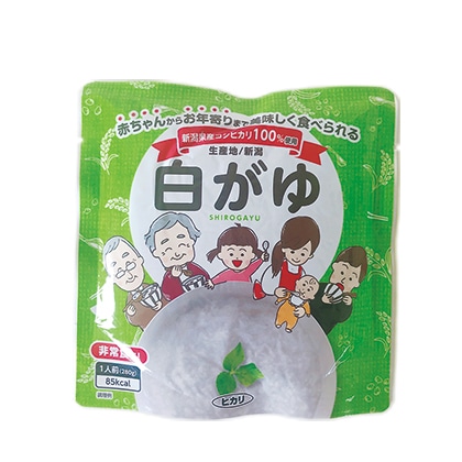 新潟県産コシヒカリを100%使用した、こだわりの白がゆです。5年半保存可能な備蓄用タイプです。