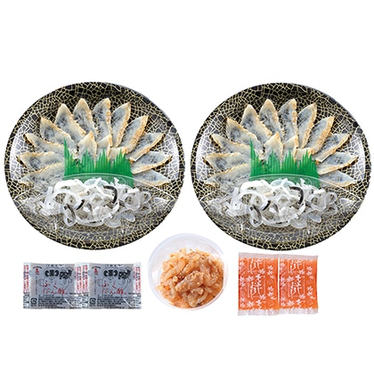 ●商品内容/真ふぐたたき刺身(17cm皿)・とらふぐ皮 各20g×2、とらふぐ塩辛60g、ふくポン酢・もみじおろし 各10g×2