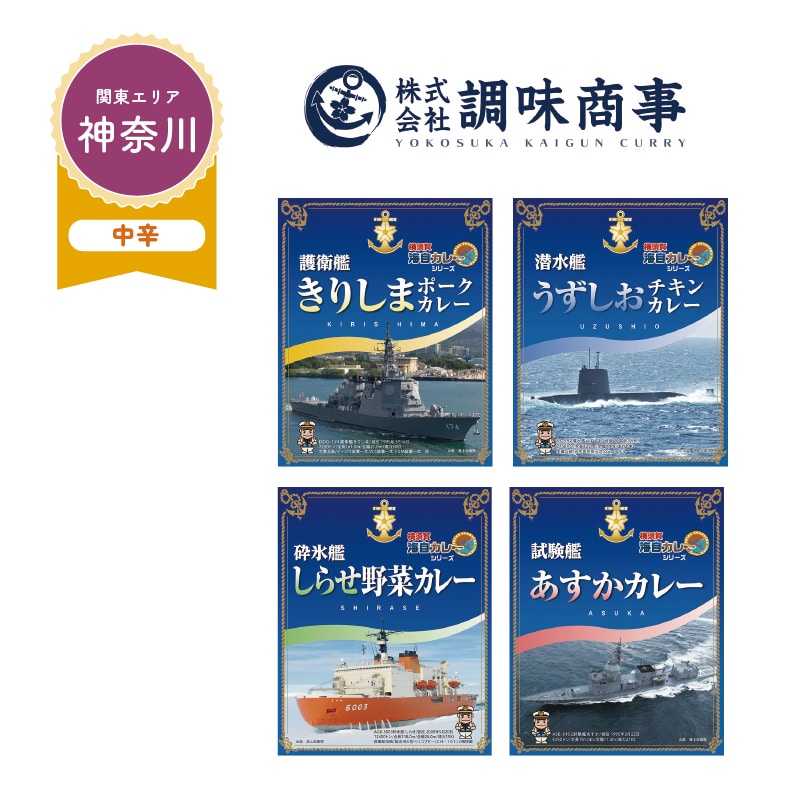 海上自衛隊横須賀地方総監部全面協力のもと、地元のレストランと作り上げたレトルトカレーのうち、「護衛艦きりしまポークカレー」「潜水艦うずしおチキンカレー」「砕氷艦しらせ野菜カレー」「試験艦あすかカレー」の人気カレー4種の食べ比べセットです。