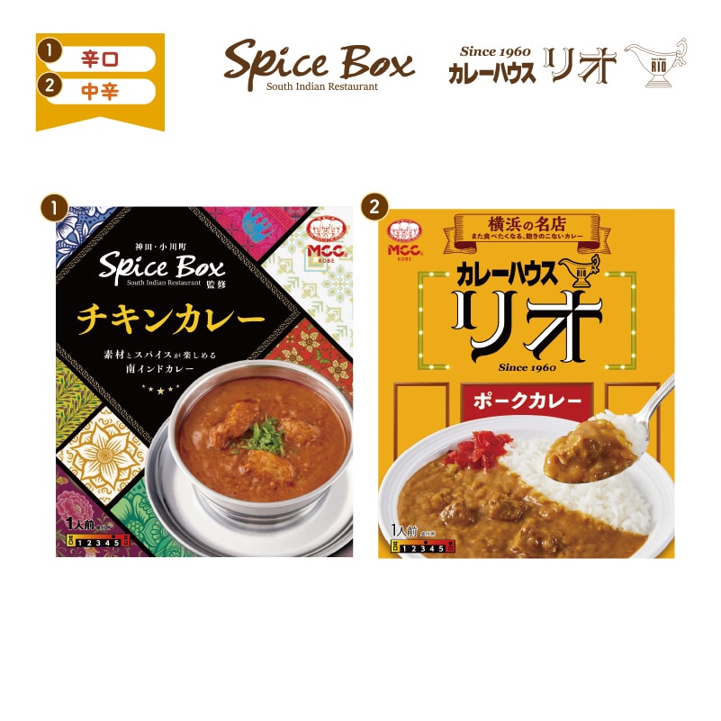 ●商品内容/1スパイスボックスチキンカレー190g、2カレーハウスリオポークカレー200g