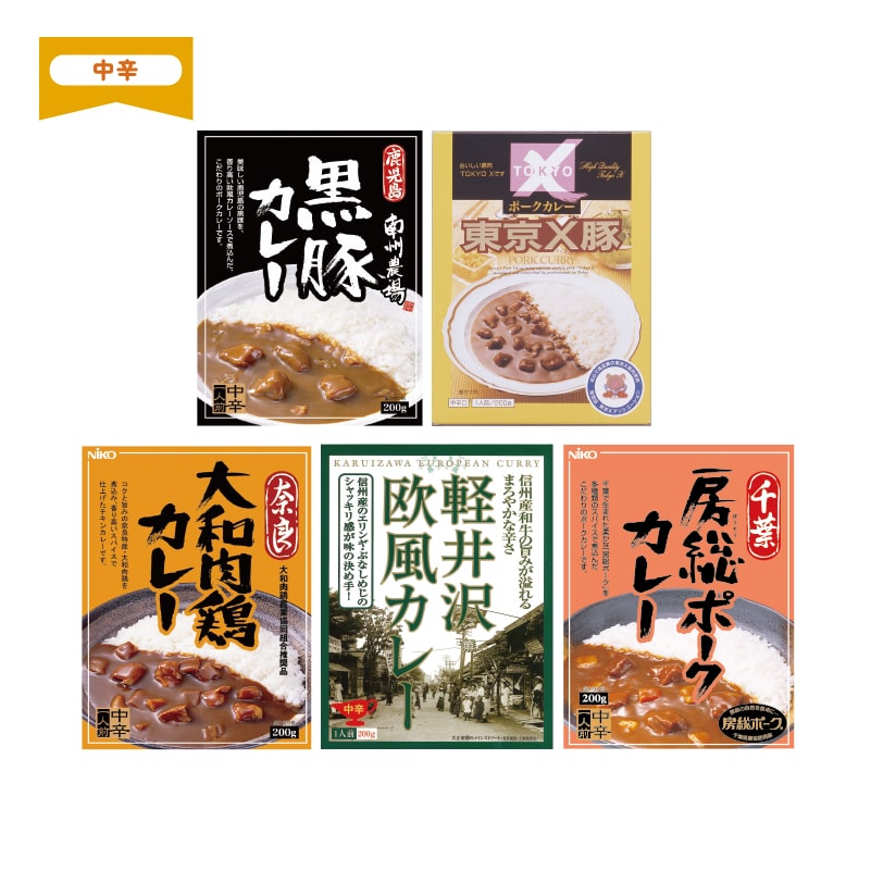 ●商品内容/1南州農場黒豚カレー・2東京X豚ポークカレー・3大和肉鶏カレー・4軽井沢欧風カレー・5房総ポークカレー 各200g