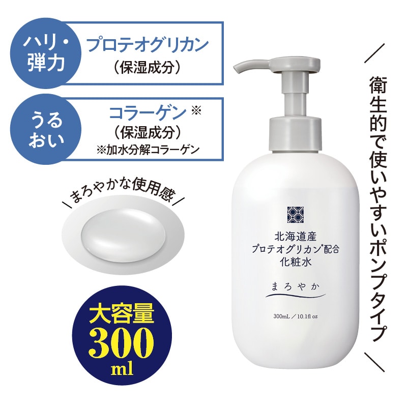 弾力のあるハリ肌へ。北海道で一貫生産されたこだわりの水溶性プロテオグリカン(保湿成分)は優れた保水性で年齢肌をいきいきした肌へ導き、ハリ・弾力・うるおいをあたえます。衛生的で使いやすいポンプタイプ。