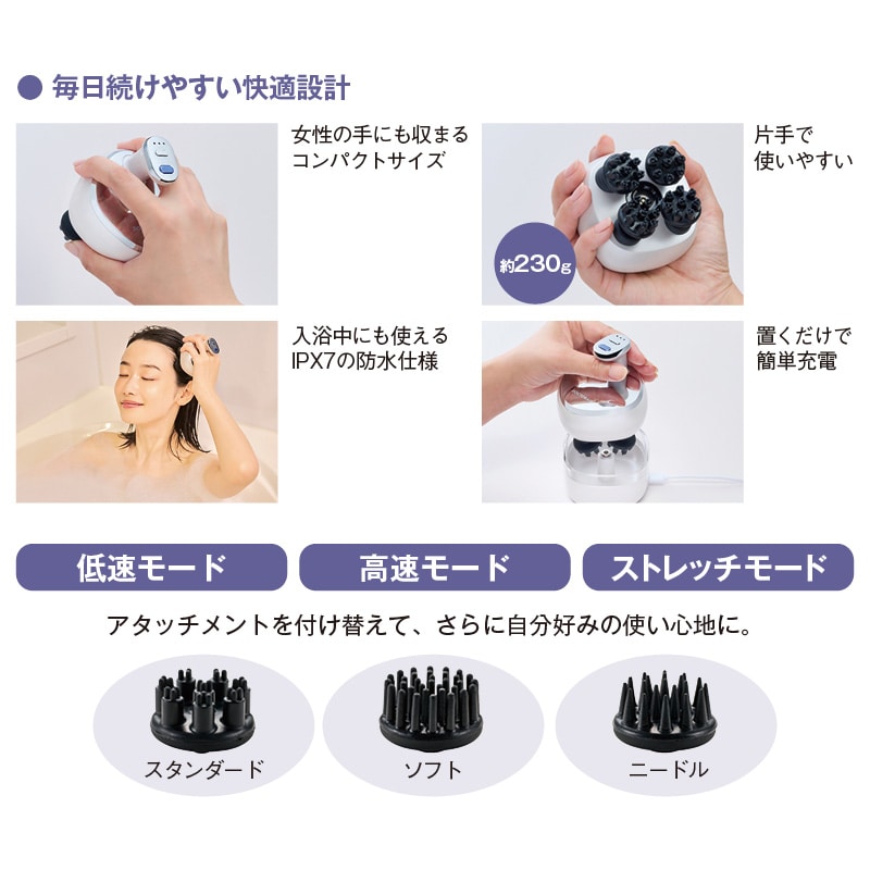 メーカーこだわりの「もみ」でスカルプケア。頭皮をリフレッシュする心地よさ。片手で使いやすく、女性の手にも収まるコンパクトサイズ。入浴中にも使えるIPX7の防水仕様。アタッチメントを付け替えて、さらに自分好みの使い心地に。