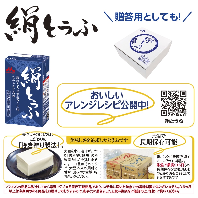 口どけが良くなめらかでそのままでも美味しい。美味しさを追求したとうふです。大豆を水に漬けずに作る「挽き搾り製法」のため美味しさを逃しません。贈答用としても!