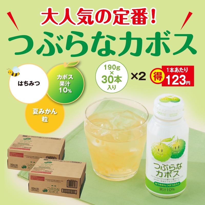 「つぶらな」シリーズの人気ナンバーワン(2026年つぶらなカボスと仲間たち冬号(1〜3月実績))の味!大分県産カボスのさわやかな香り・ほどよい甘さ・夏みかんのつぶつぶ食感を楽しむことができ、幅広い世代から愛されています。
