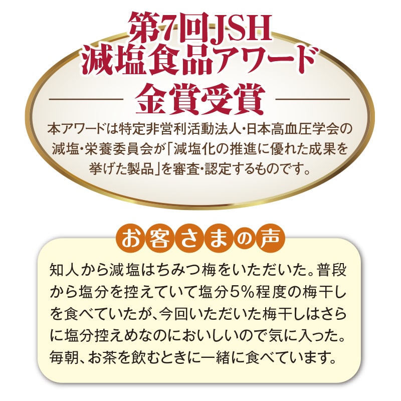 おいしさそのままで塩分約3%に仕上げました。さわやかな甘さとバランスの良い味わいが特長です。雹被害による傷や斑点、皮が破れた梅が入る可能性がございます。また、梅本来の水分が表面に出ることもありますが、お味は変わりません。