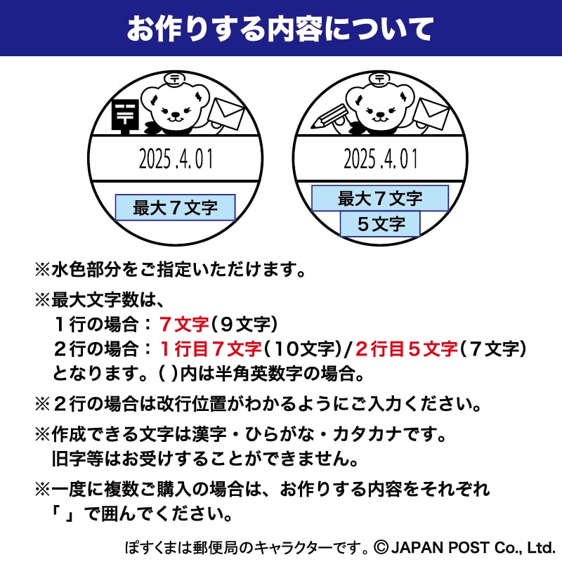 ●文字数は1行の場合:7文字(9文字)・2行の場合:1行目7文字(10文字)/2行目5文字(7文字)。()内は半角英数字の場合。2行の場合は改行位置がわかるようにご入力ください。