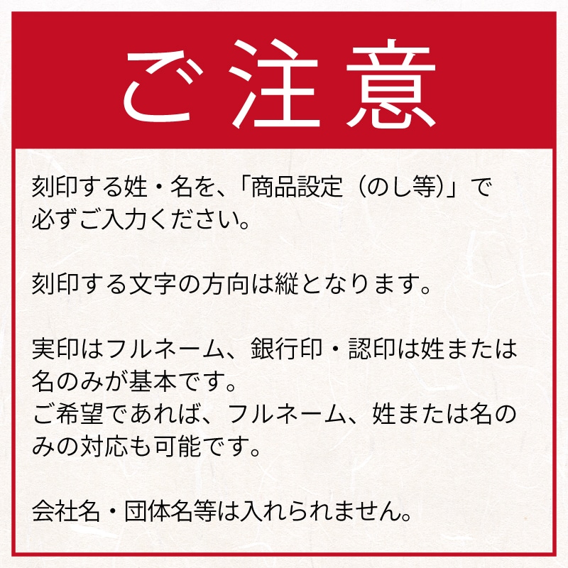 ※実印はフルネーム、銀行・認印は姓または名のみが基本ですが、ご希望であれば、フルネーム、姓または名のみの対応も可能です。