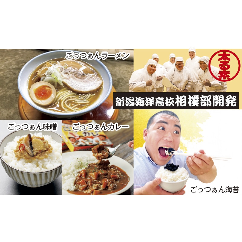 新潟海洋高校相撲部が開発した新潟県産甘えびの魚醤で美味しく仕上げたシーフードカレーと、魚醤と鶏がらのスープが美味しいラーメン、ごっつぁん海苔とごっつぁん味噌のセットです。