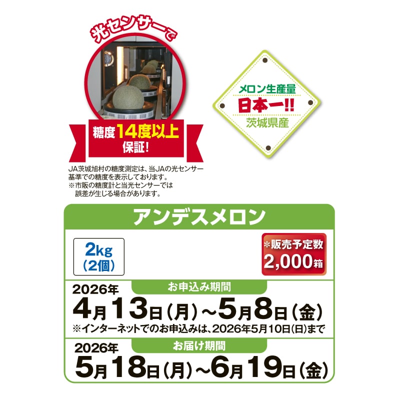 ※掲載商品は青果物ですので、天候、作柄状況により、商品のお届けが前後する場合がございます。また、販売予定数到達前に販売を終了させていただく場合があります。あらかじめご了承ください。