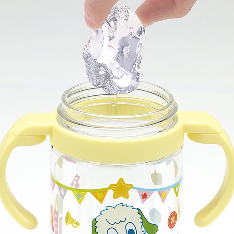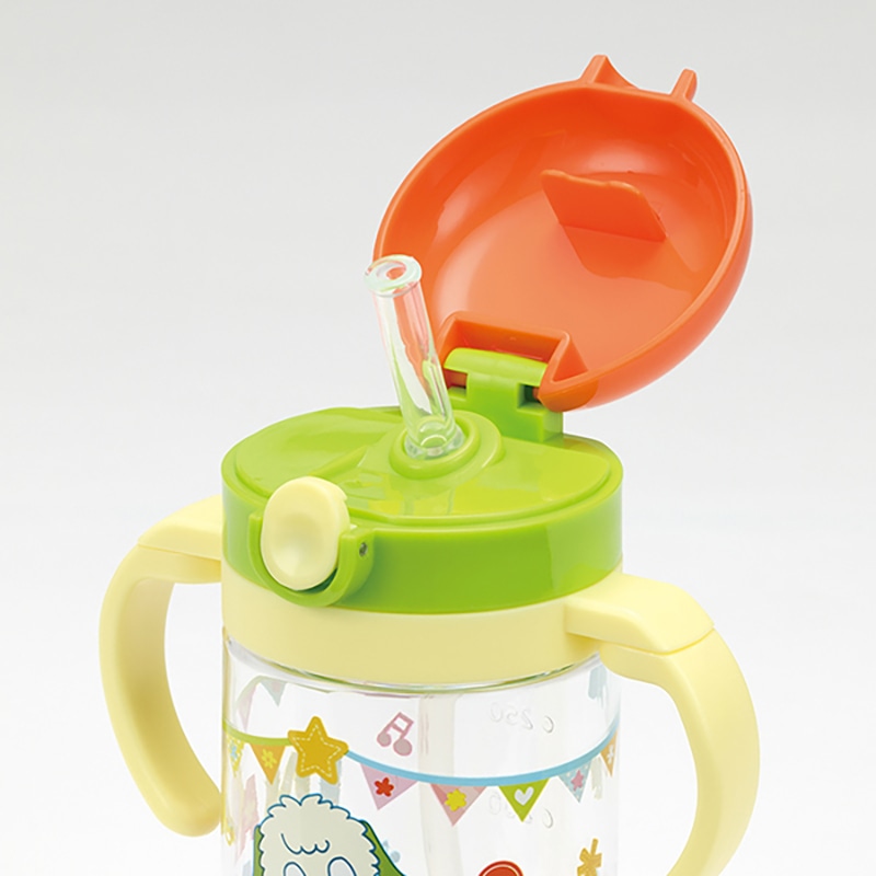 折りたたみ式の両手ハンドルとショルダーベルトが付いたストロー式のマグ。ハンドル付きとハンドル無しで2通りの持ち方ができる。ショルダーベルトをハンドル付きのリングに替えると持って飲む練習に使える。赤ちゃんがストローで吸うトレーニングにおすすめ。本体は割れにくく透明度の高いPET素材を使用。ハンドルは前後にたためる為、コンパクトになって持ち運びに便利。キャップを後ろに90度倒すと固定できるキャップロック設計。倒れにくい幅広な底形状。対象年齢は1才頃から。食洗機は対応していない。