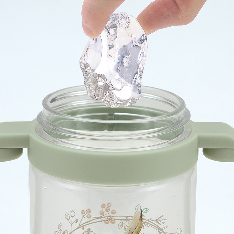 折りたたみ式の両手ハンドルとショルダーベルトが付いたストロー式のマグ。ハンドル付きとハンドル無しで2通りの持ち方ができる。ショルダーベルトをハンドル付きのリングに替えると持って飲む練習に使える。赤ちゃんがストローで吸うトレーニングにおすすめ。本体は割れにくく透明度の高いPET素材を使用。ハンドルは前後にたためる為、コンパクトになって持ち運びに便利。キャップを後ろに90度倒すと固定できるキャップロック設計。倒れにくい幅広な底形状。対象年齢は1才頃から。食洗機は対応していない。