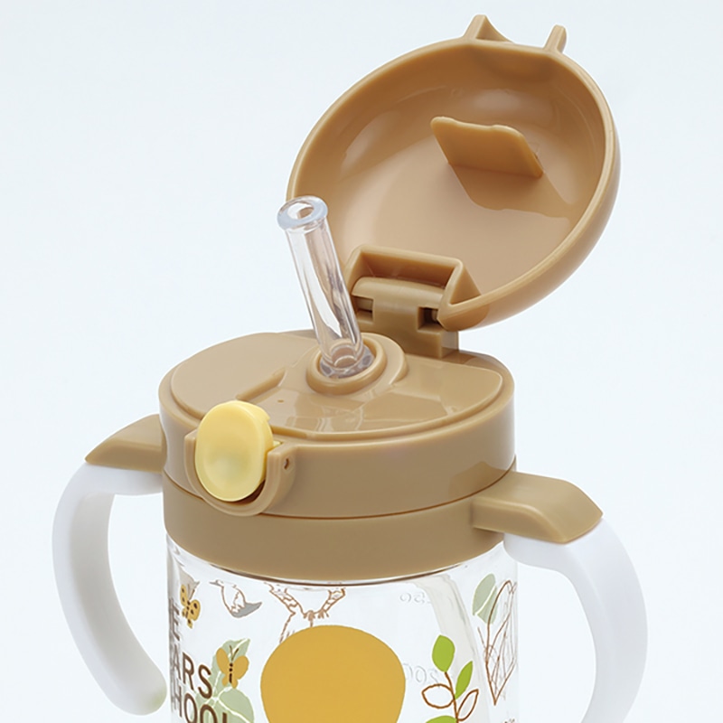 折りたたみ式の両手ハンドルとショルダーベルトが付いたストロー式のマグ。ハンドル付きとハンドル無しで2通りの持ち方ができる。ショルダーベルトをハンドル付きのリングに替えると持って飲む練習に使える。赤ちゃんがストローで吸うトレーニングにおすすめ。本体は割れにくく透明度の高いPET素材を使用。ハンドルは前後にたためる為、コンパクトになって持ち運びに便利。キャップを後ろに90度倒すと固定できるキャップロック設計。倒れにくい幅広な底形状。対象年齢は1才頃から。食洗機は対応していない。