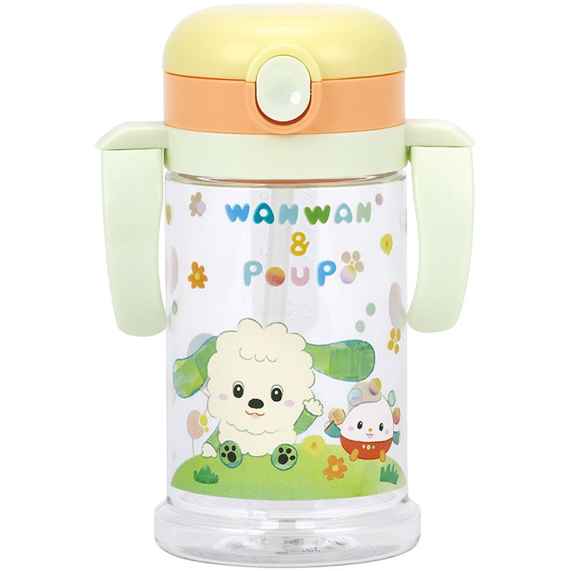 折りたたみ式の両手ハンドルとショルダーベルトが付いたストロー式のマグ。ハンドル付きとハンドル無しで2通りの持ち方ができる。ショルダーベルトをハンドル付きのリングに替えると持って飲む練習に使える。赤ちゃんがストローで吸うトレーニングにおすすめ。本体は割れにくく透明度の高いPET素材を使用。ハンドルは前後にたためる為、コンパクトになって持ち運びに便利。キャップを後ろに90度倒すと固定できるキャップロック設計。倒れにくい幅広な底形状。対象年齢は1才頃から。食洗機は対応していない。