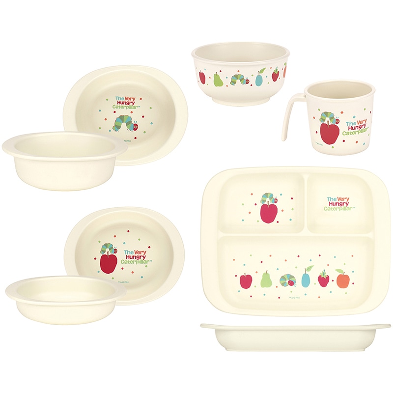 ベビー食器が一式揃う食器セット。可愛い化粧箱入り。セット内容は、コップ、茶わん、小鉢、小皿、ランチ皿。銀イオン配合の抗菌仕様。電子レンジと食洗機に対応。熱湯、薬液、電子レンジでの消毒は可能で、煮沸消毒は不可。コップ、茶わん、小鉢、小皿は重ねて収納できる。【[コップ (XP21AG)】小さな手でも持ちやすい持ち手付き。手を差し込んで持ったり、握ったり、小さな手でも安定しやすい。厚めで口当たりの良いフチ。5ヶ月頃からのお食事練習にもおすすめ。【茶わん (XP23AG)】浅めで指がとどきやすい。指を掛けやすいフチ。倒れにくい広めの高台。5ヶ月頃からのお食事練習にもおすすめ。【小鉢 (XP24AG)】【小皿 (XP25AG】返りがあってお料理をすくいやすい。持ちやすいフチ付き。食器の角が丸くてスプーンに沿う。5ヶ月頃からのお食事練習にもおすすめ。【ランチ皿 (XP7AG)】お皿は3つに仕切られ、食べ物を盛りつけやすい。仕切りが高いので食べ物がはみ出しにくい。お皿の手前はほぼ直角の立ち上がりですくいやすい。奥はなだらかで食べ物を集めやすい。持ちやすいフチ付き。8ヶ月頃からのお食事練習におすすめ。