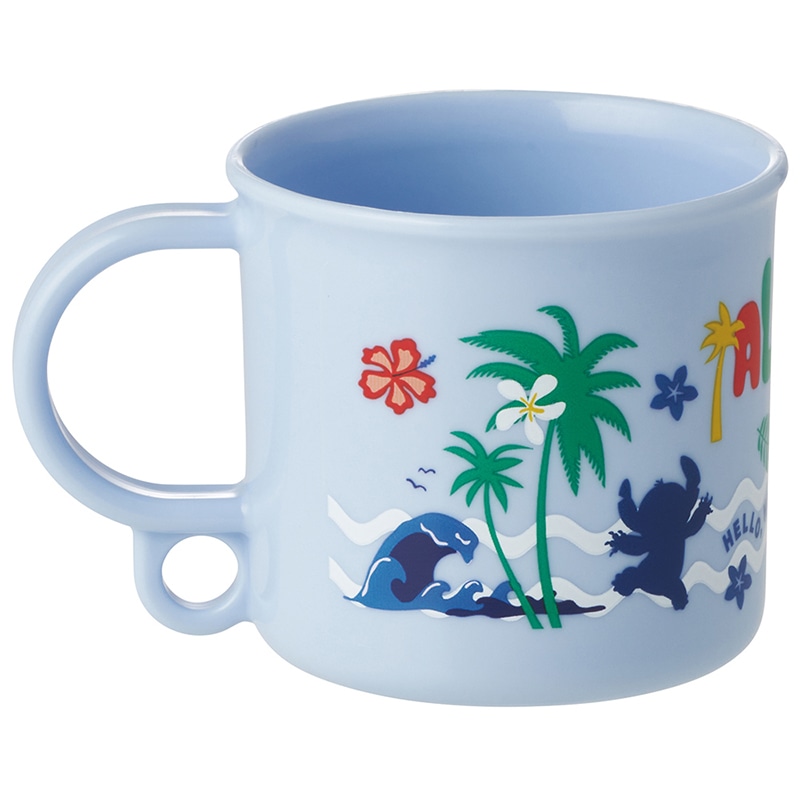 食洗機対応のプラスチック製のコップ。逆さに吊れるフック穴付き。逆さに吊り下げられるので水切れが良く、衛生的に保管できる。電子レンジにも対応。名前シール入り。