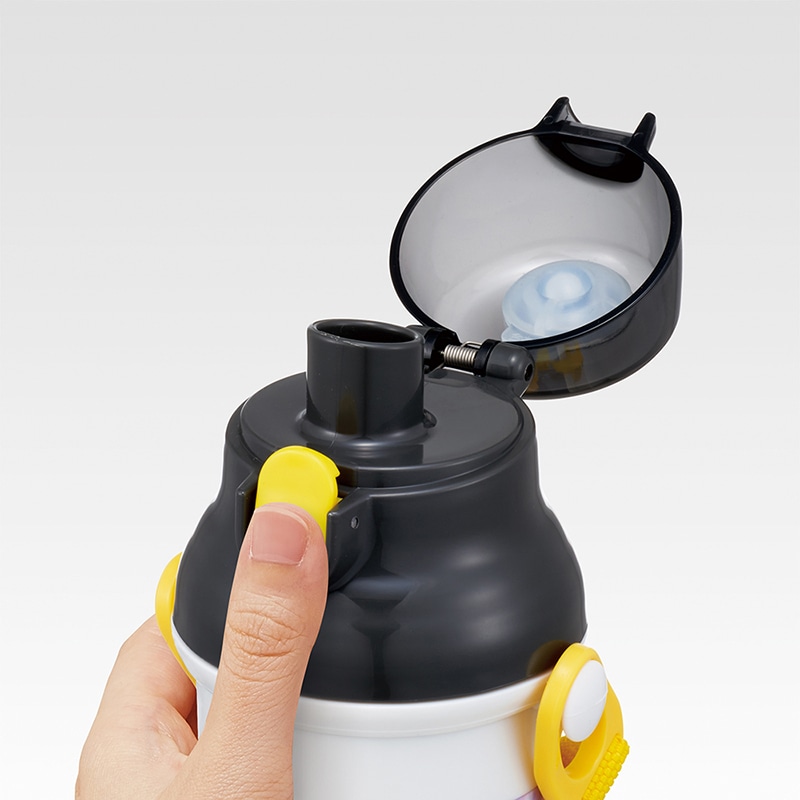 食洗機対応のプラスチック製直飲みボトル(水筒)。キャップを開けるとすぐ飲めるダイレクト飲み口。キャップはワンプッシュ式で簡単にオープン。軽くて持ちやすい形状。氷が入れやすい広口タイプ。肩に掛けて持ち運べるショルダーベルト付き。ショルダーベルトは取り外せ、長さ調節もできる。