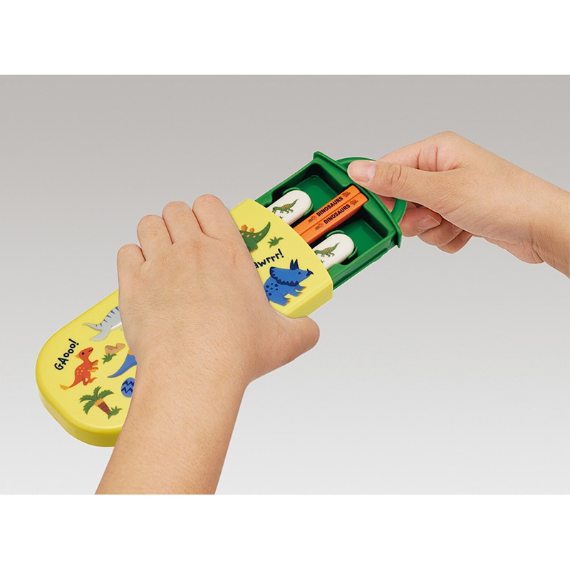 食洗機対応のお箸、フォーク、スプーンとケースのセット。ケースは指で引き出すスライド式で衝撃に強く丈夫な構造。ケースは分解できて洗いやすい。お箸には名前を書くスペース付きで、先端にはすべり止め付き。スプーンとフォークの先端はステンレス製。ケース用の名前シール入り。