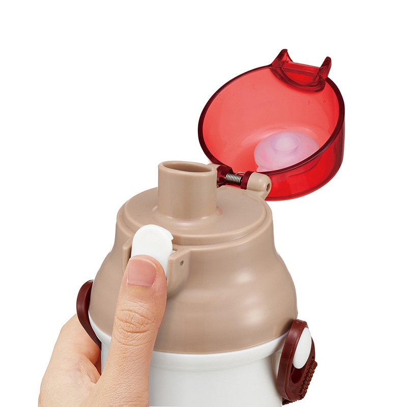 食洗機対応のプラスチック製直飲みボトル(水筒)。キャップを開けるとすぐ飲めるダイレクト飲み口。キャップはワンプッシュ式で簡単にオープン。軽くて持ちやすい形状。氷が入れやすい広口タイプ。肩に掛けて持ち運べるショルダーベルト付き。ショルダーベルトは取り外せ、長さ調節もできる。