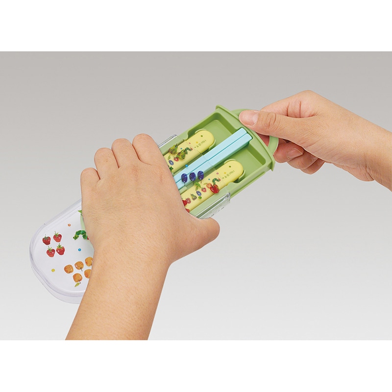 食洗機対応のお箸、フォーク、スプーンとケースのセット。ケースは指で引き出すスライド式で衝撃に強く丈夫な構造。ケースは分解できて洗いやすい。お箸には名前を書くスペース付きで、先端にはすべり止め付き。スプーンとフォークの先端はステンレス製。ケース用の名前シール入り。