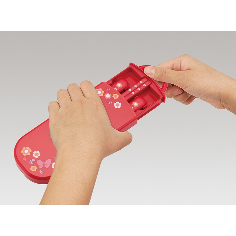 食洗機対応のお箸、フォーク、スプーンとケースのセット。ケースは指で引き出すスライド式で衝撃に強く丈夫な構造。ケースは分解できて洗いやすい。お箸には名前を書くスペース付きで、先端にはすべり止め付き。スプーンとフォークの先端はステンレス製。ケース用の名前シール入り。