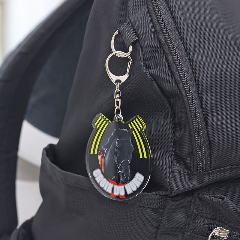 蹄鉄をイメージした勝負服柄の枠に競走馬の肖像を配置したアクリルキーホルダー。ショルダーバッグやリュックなどで“さり気なく推しを主張できる”サイズ感になっております。