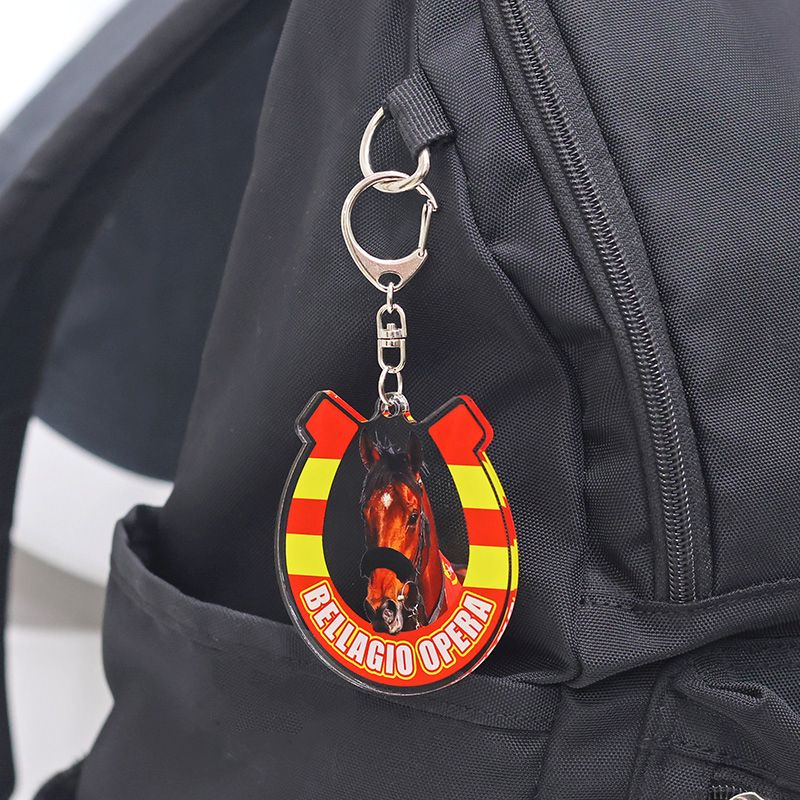 蹄鉄をイメージした勝負服柄の枠に競走馬の肖像を配置したアクリルキーホルダー。ショルダーバッグやリュックなどで“さり気なく推しを主張できる”サイズ感になっております。