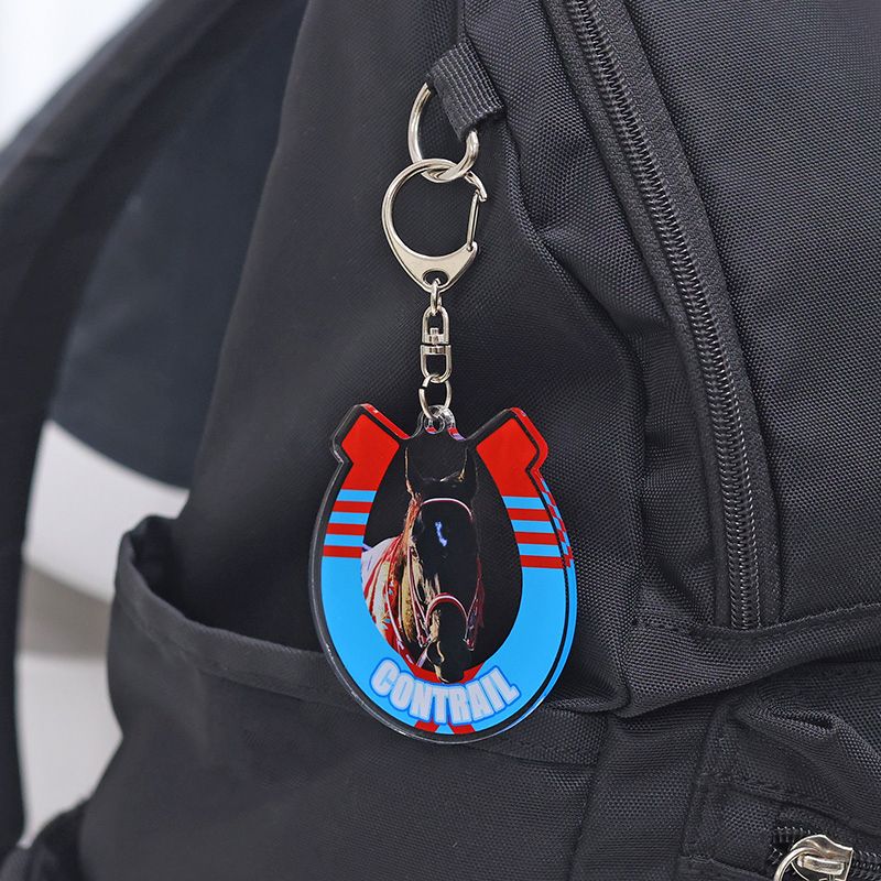 蹄鉄をイメージした勝負服柄の枠に競走馬の肖像を配置したアクリルキーホルダー。ショルダーバッグやリュックなどで“さり気なく推しを主張できる”サイズ感になっております。